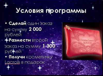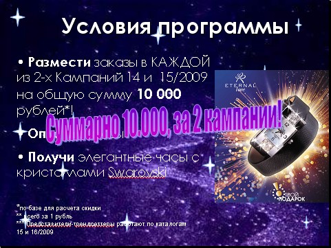 Условия программы Размести заказы в КАЖДОЙ из 2-х Кампаний 14 и 15/2009 на общую сумму 10 000 рублей*! Оплати заказы Получи элегантные часы с кристаллами Swarovski