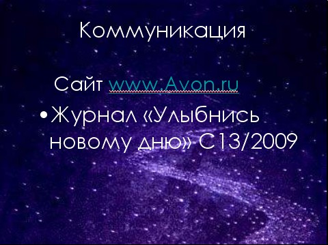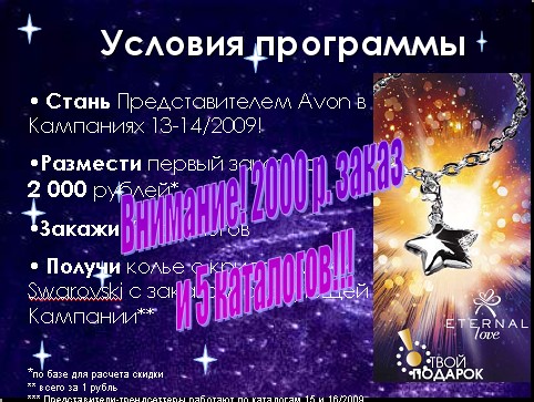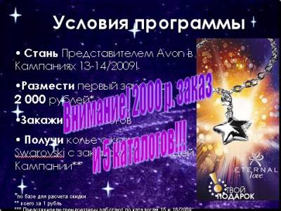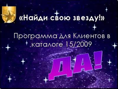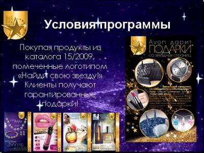 1.«Найди свою звезду!» Программа для Клиентов в каталоге 15/2009 Условия программы Покупая продукты из каталога 15/2009, помеченные логотипом «Найди свою звезду!» Клиенты получают гарантированные подарки! _____________________________ 2.«Зажги свою звезду!» Программа Поощрения для Новых Представителей Участники Программы Новые Представители Сроки проведения С Кампании 13/2009 по Кампанию 14/2009 Условия программы Стань Представителем Avon в Кампаниях 13-14/2009! Размести первый заказ на 2 000 рублей* Закажи 5 каталогов Получи колье с кристаллами Swarovski с заказом следующей Кампании**