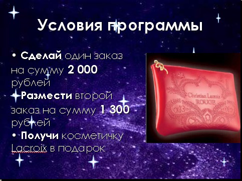 3.Программа Поощрения для Представителей «Больше заказов – больше подарков!» Срок проведения Кампания 13/2009 условия программы Сделай один заказ на сумму 2 000 рублей Размести второй заказ на сумму 1 300 рублей Получи косметичку Lacroix в подарок Комуникации Сайт www.Avon.ru Журнал «Улыбнись новому дню» С13/2009 _____________________________________________________