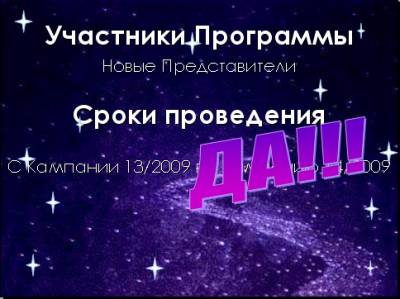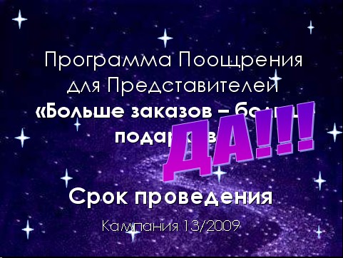 4.Зажги свою звезду Программа Поощрения для Представителей Участники Программы Представители LOA>1 Сроки проведения С Кампании 14/2009 по Кампанию 15/2009